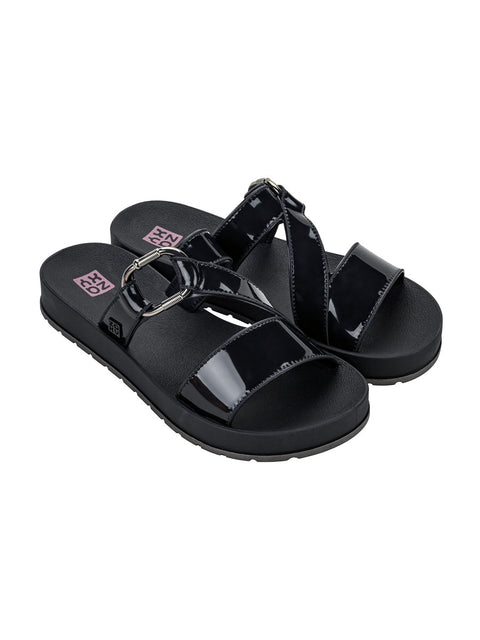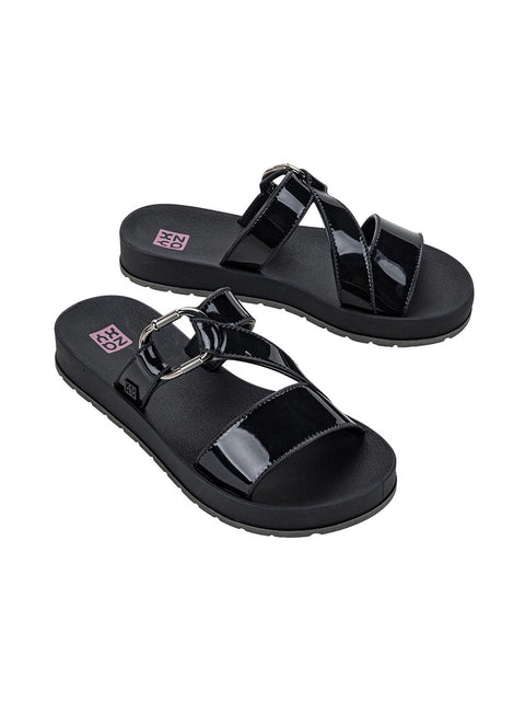 The asymmetrical cross straps, already iconic at Zaxy, are given a sophisticated touch with the metallic hoop embellishment, inspired by the fashionista jewelry that dominates the runways. With a timeless...